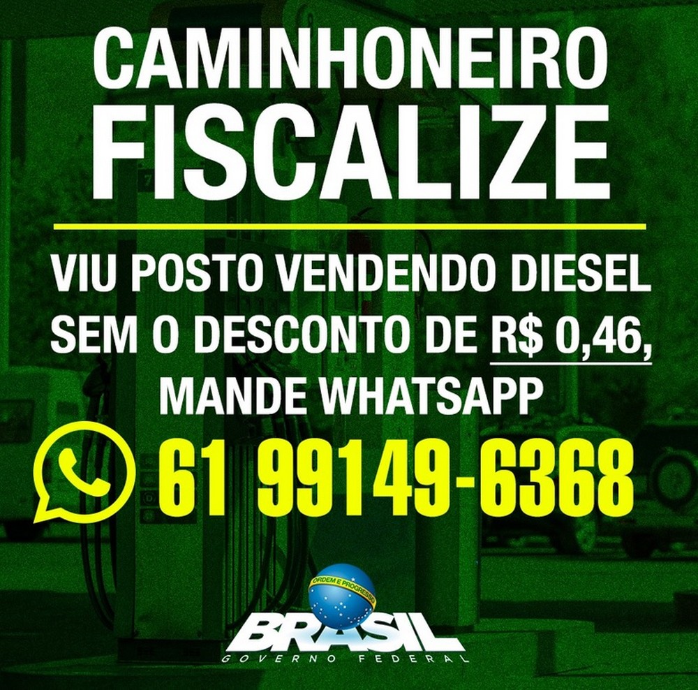 “Atenção, caminhoneiro! Este é seu canal para denúncia. De hoje até segunda-feira, de acordo com a renovação dos estoques, todas as bombas do país devem oferecer desconto de R$ 0,46 no litro do diesel. Ajude-nos a fiscalizar”, diz mensagem divulgada pelo Planalto.