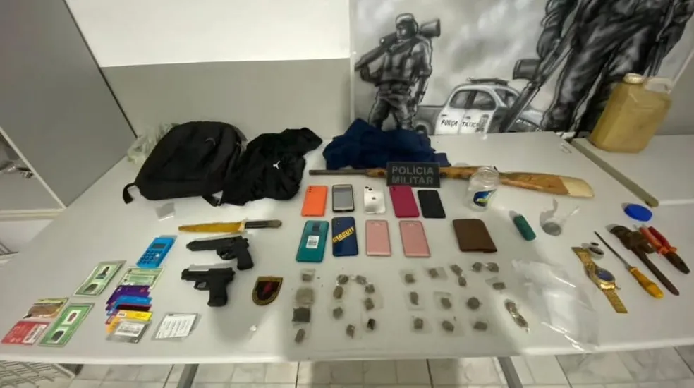 Os policiais militares também apreenderam duas armas de fogo, dois simulacros, drogas, uma motocicleta roubada, munições, dinheiro, balanças de precisão e diversos materiais utilizados no tráfico de drogas.