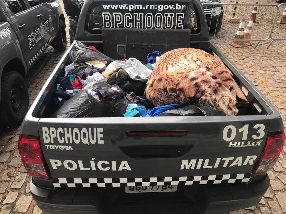 No local, foram apreendidos 10 celulares, câmeras de filmagem profissionais, equipamentos de gravação, três armas, um simulacro de pistola, chaves de carros, além de várias roupas, que teriam sido levadas na semana passada de uma loja que fica em Parnamirim por esse mesmo grupo de assaltantes.