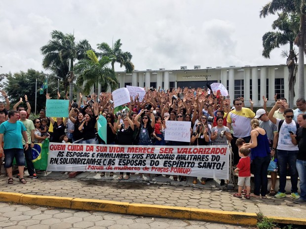 Policiais militares e bombeiros do Rio Grande do Norte fazem um ato em frente à Governadoria, em Natal, na manhã desta terça-feira (14). As mulheres dos militares também participam do protesto no Centro Administrativo. Segundo o comando da PM, o patrulhamento nas ruas da cidade segue normal.