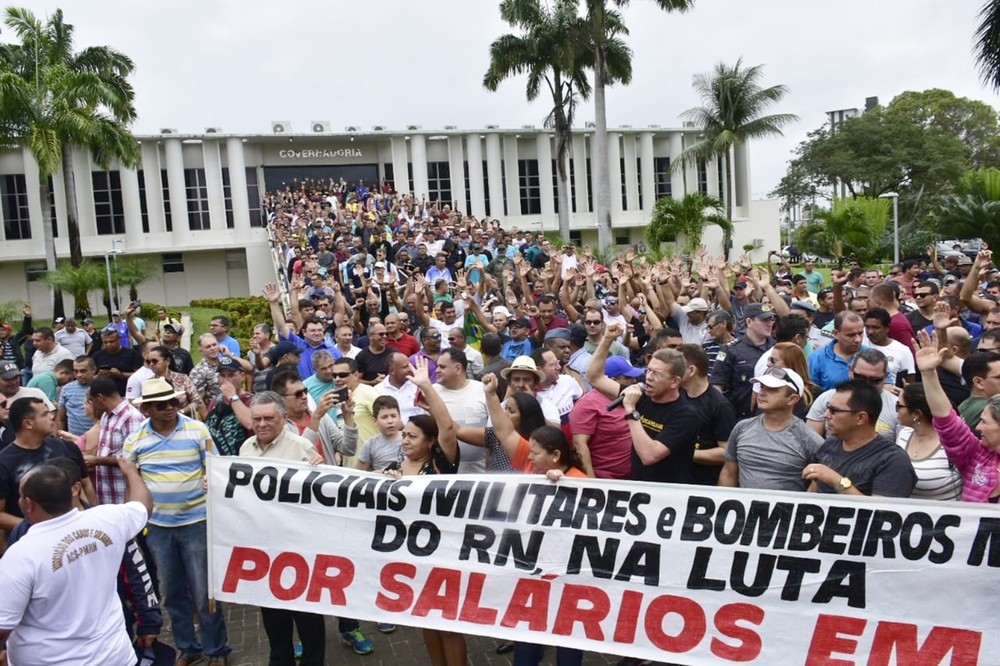 Policiais e bombeiros militares do Rio Grande do Norte iniciaram na manhã desta segunda-feira (17) uma paralisação por tempo indeterminado. Reajuste salarial, pagamento de folhas atrasadas e recomposição do efetivo estão na pauta de reivindicações. A parada inclui praças e oficiais das duas corporações, que desde às 8h se encontram reunidos em frente à Governadoria, no Centro Administrativo do Estado, em Natal.