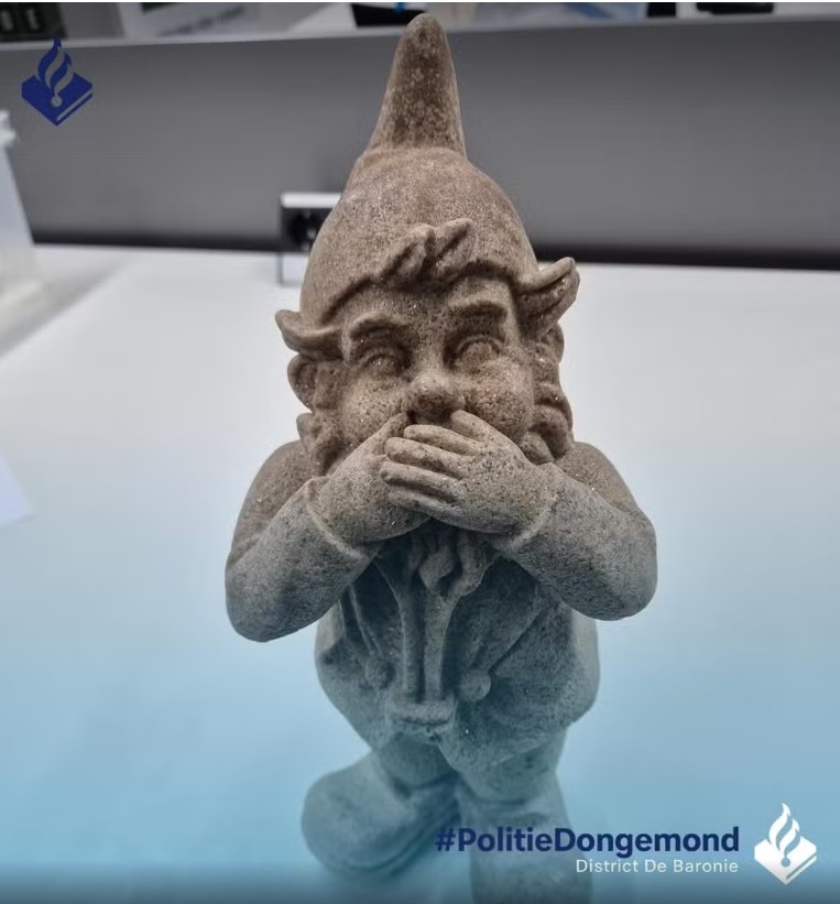 A polícia de uma cidade no sul da Holanda encontrou uma estátua de aproximadamente dois quilos de um gnomo feita com a droga MDMA, conhecida como ecstasy. A droga foi encontrada durante uma operação de busca e apreensão na cidade de Dongemond, no sul do país.
