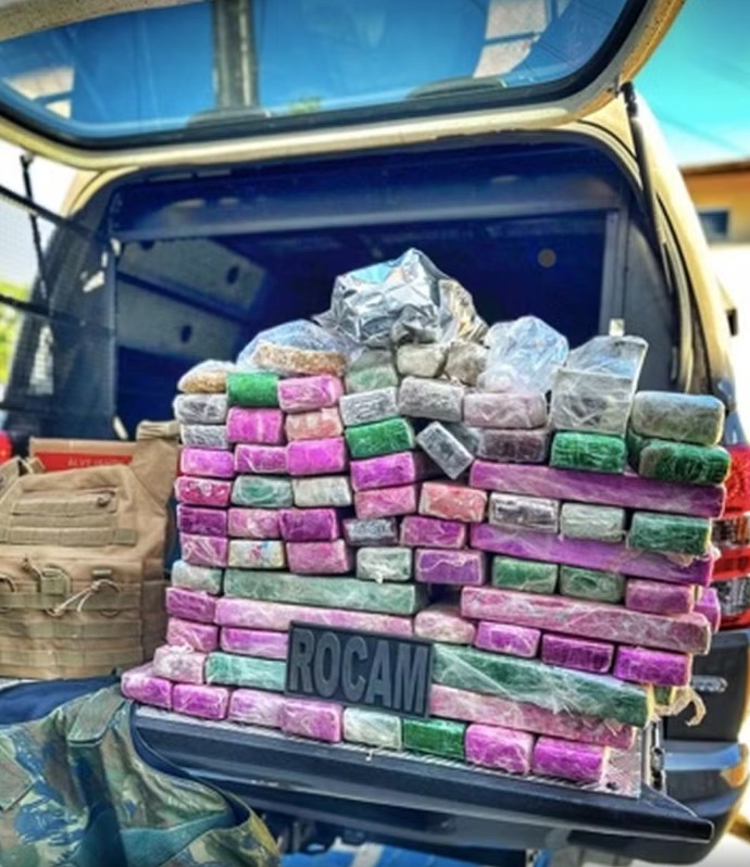 Após diligências, a equipe apreendeu aproximadamente 101 kg de maconha, 2,5 kg de crack, cerca de 1 kg de skank, um cinto tático com coldre e duas capas de colete balístico.