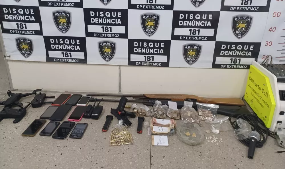 Além do drone, foram apreendidos uma pistola, duas espingardas, R$ 3 mil em dinheiro fracionado, porções de cocaína, pedras de “crack”, maconha e uma balança de precisão.