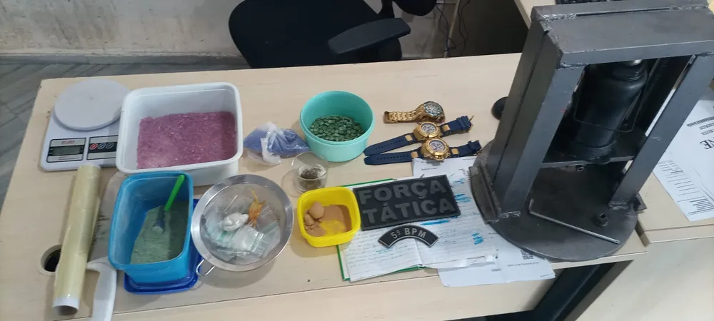 Também foram apreendidos diversos “granulados” de MD; papel filme; sacos plásticos para embalar drogas; três relógios; faca; balança de precisão e uma agenda de contabilidade.