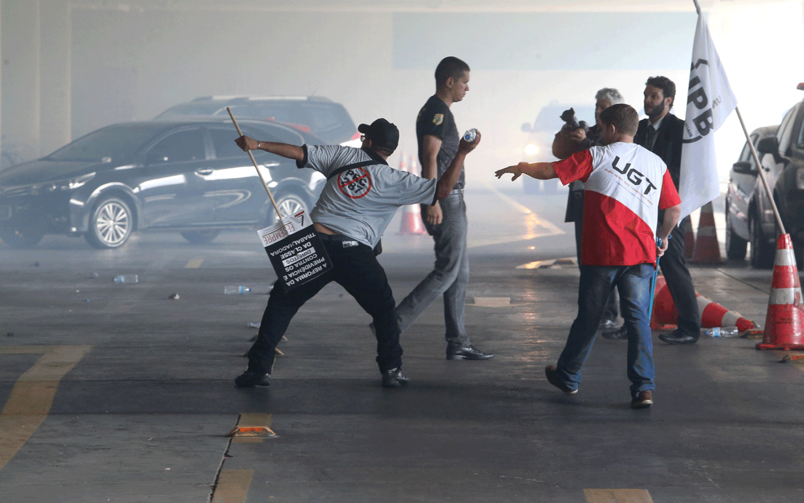 Policiais civis, rodoviários e federais de vários estados e do Distrito Federal protestaram na tarde de ontem (18), em Brasília, contra a proposta de reforma da Previdência. Durante o ato, um grupo de policiais tentou invadir a chapelaria do Congresso Nacional. Houve tumulto, e vidraças do prédio foram quebradas. A manifestação foi convocada pela União Policiais do Brasil (UPB). A Polícia Legislativa usou spray de pimenta e bombas para dispersar o conflito. Até as 16h, não havia registro de feridos.