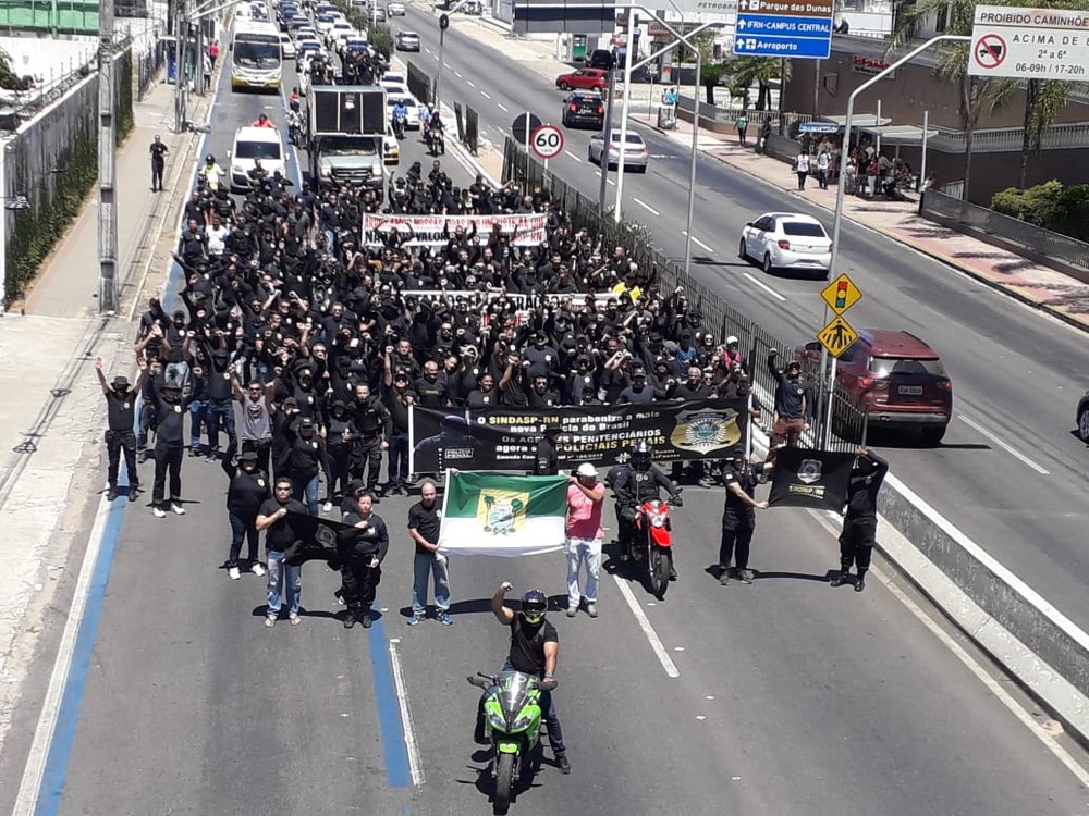 Durante a manhã desta segunda-feira (9), os policiais penais fizeram uma caminhada pela avenida Salgado Filho, saindo do shopping Midway Mall no sentido ao Centro Administrativo do Poder Executivo Estadual, fechando o trânsito na via, até a marginal da BR-101, próximo à Arena das Dunas.