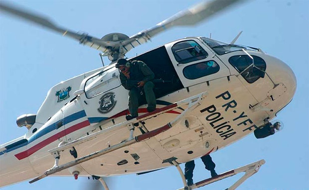 O helicóptero Potiguar 01, aeronave da Secretaria de Segurança Pública e da Defesa Social (Sesed), participa das ações.