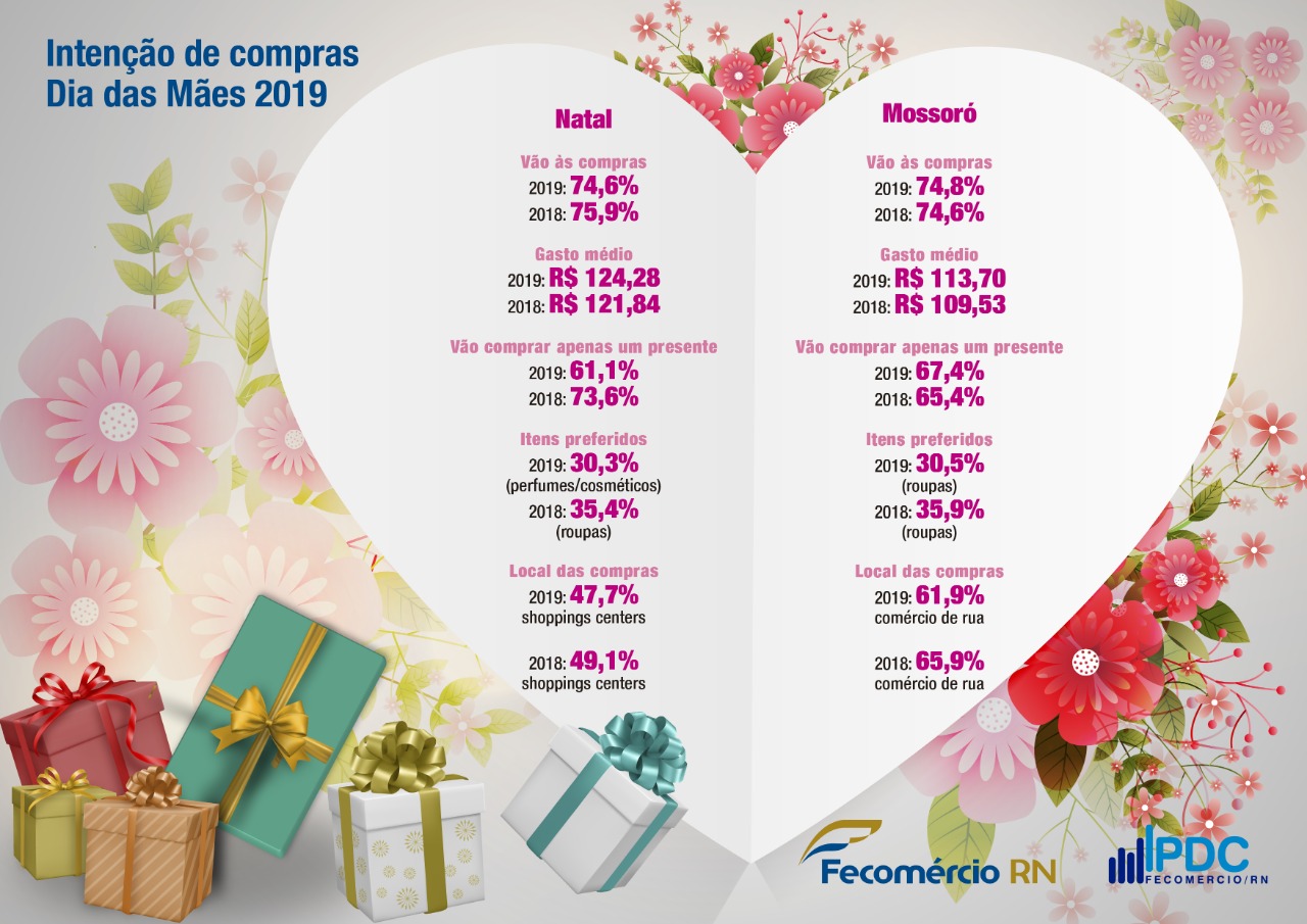O Dia das Mães é considerada a segunda melhor data para o comércio varejista, e será comemorado no próximo domingo, 12 de maio. Como acontece todos os anos, o Instituto de Pesquisa e Desenvolvimento do Comércio (IPDC) da Fecomércio RN realizou a pesquisa de intenção de compras para a data, nas cidades de Natal e Mossoró. Em Natal, foram entrevistadas 650 pessoas entre os dias 22 e 25 de abril; e em Mossoró, 500 pessoas entre os dias 29 de abril e 1 de maio.
