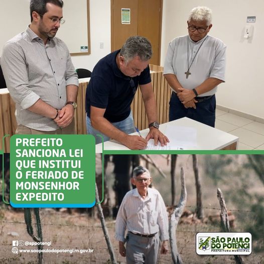 Na última segunda-feira (29), o Prefeito Municipal, Pacelli Souto, sancionou a Lei n° 1.049/2021 (de autoria do vereador Alysson Lindálrio) que institui o feriado municipal do Dia de Monsenhor Expedito Sobral de Medeiros, a ser comemorado anualmente em 16 de janeiro.