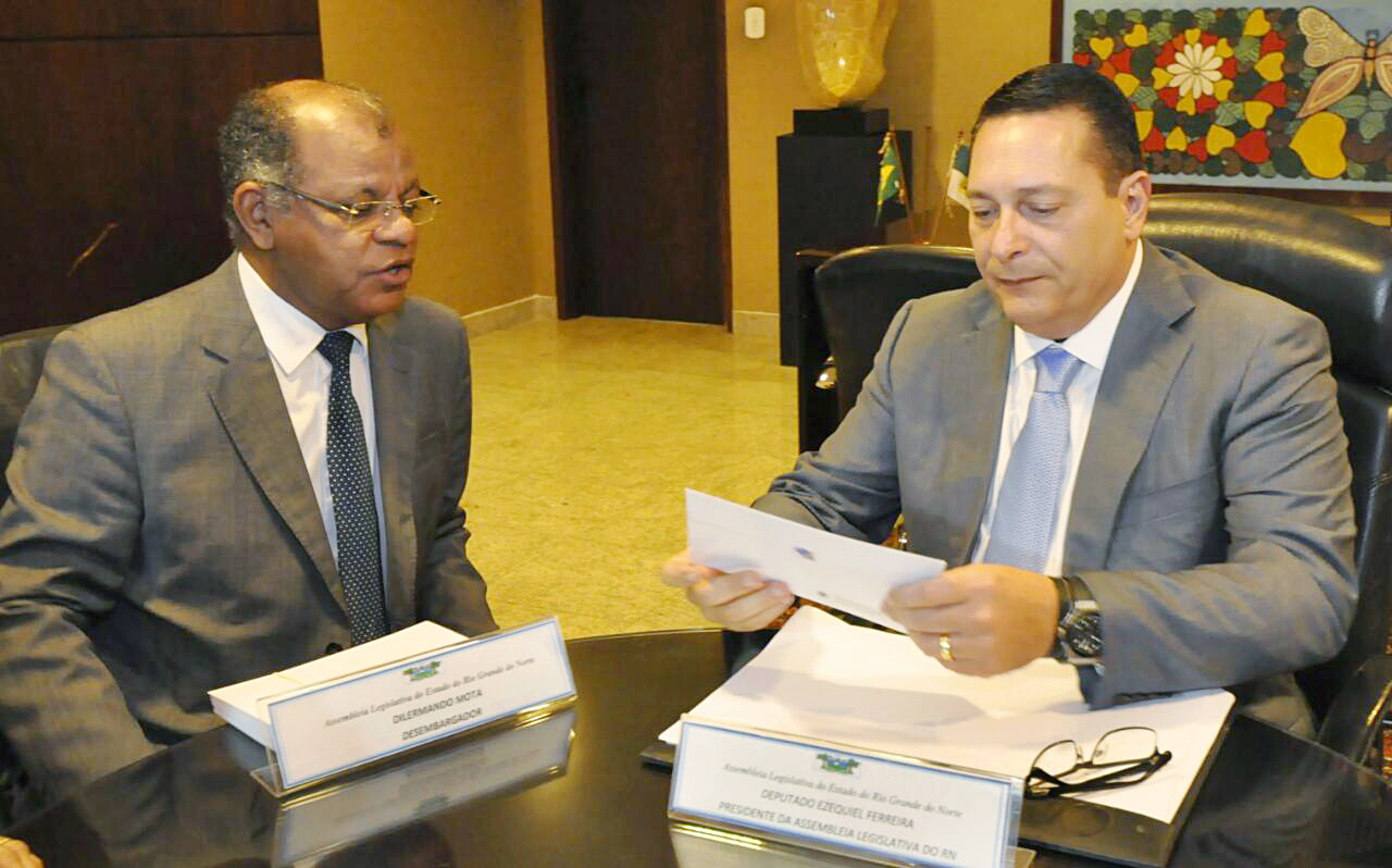 O presidente da Assembleia Legislativa, deputado Ezequiel Ferreira de Souza (PSDB), recebeu das mãos do desembargador Dilermano Mota, nesta terça-feira (16), o convite para a posse do magistrado como presidente do Tribunal Regional Eleitoral (TRE/RN), para o biênio 2016/2018, no próximo dia 1º de setembro, às 17h, no Centro de Operações da Justiça Eleitoral. O desembargador Dilermano Mota e seu vice, desembargador Ibanez Monteiro foram eleitos, em maio, para dirigirem o Tribunal Regional Eleitoral do Rio Grande do Norte (TRE/RN) no biênio 2016-2018, em eleição no Pleno do TJRN na sessão administrativa da Corte Estadual de Justiça.