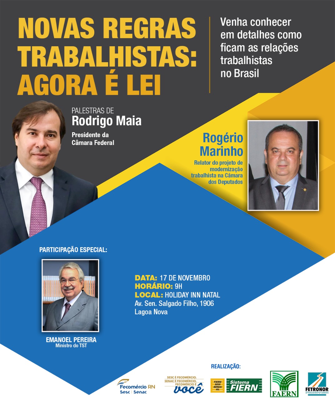 O presidente da Câmara dos Deputados, Rodrigo Maia (DEM), estará em Natal nesta sexta-feira (17) para realizar palestra sobre a modernização da lei trabalhista. O evento, denominado “Novas regras trabalhistas: Agora é Lei”, será realizado no Hotel Holliday Inn a partir das 8h30, e também contará com palestras do vice-presidente do TST, Emanoel Pereira, e do deputado federal Rogério Marinho (PSDB), relator do projeto na Câmara.