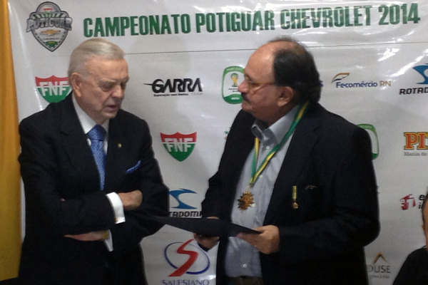 O presidente da Confederação Brasileira de Futebol (CBF), José Maria Marin, está em Natal acompanhado do vice-presidente da Federação Paulista de Futebol (FPF) e membro do comitê de organização das competições da CBF, Reinaldo Carneiro Bastos. No final da manhã de hoje (22), Marin visitou a Federação Norte-Rio-Grandense de Futebol (FNF) para entrega da maior honraria da CBF, a Comenda João Havelange ao presidente da FNF, José Vanildo, e para entrega de uma carta da Fifa designando Vanildo como embaixador da entidade no Rio Grande do Norte, por seus relevantes serviços prestados ao futebol do estado. “O José Vanildo é um homem tranquilo, vocês conhecem ele bem melhor do que eu. De vez em quando ele gosta de cantar ‘um Tim Maia’, mas na hora de defender os interesses dos clubes do seu estado ele vira uma fera”, brincou Marin.