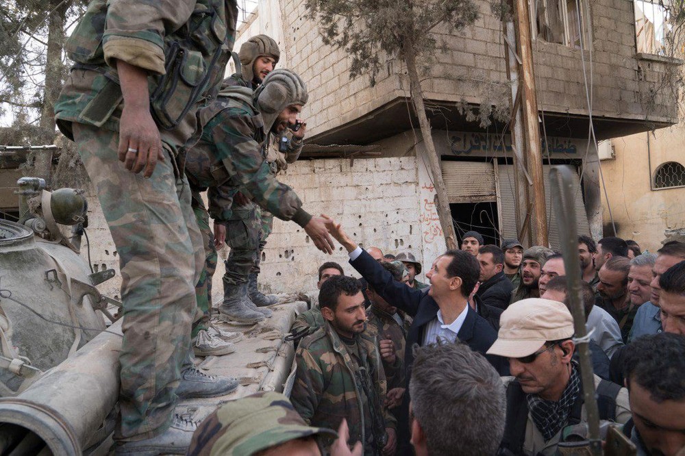 Sua visita à frente de batalha em Guta Oriental, onde imagens da televisão estatal o mostraram ovacionado por soldados enquanto fumaça surgia à distância, acontece depois que dezenas de milhares de civis começaram a deixar a área da oposição para linhas do governo.