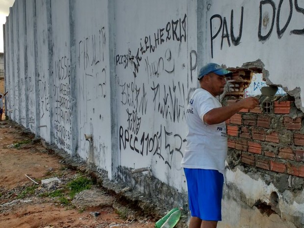 Após rebelião que começou no última dia 14 de janeiro na Penitenciária de Alcaçuz, em Nísia Floresta, Natal, presos começaram a trabalhar na reconstrução dos buracos feitos nos muros entre os pavilhões. Pichações também estão sendo retiradas pelos detentos.