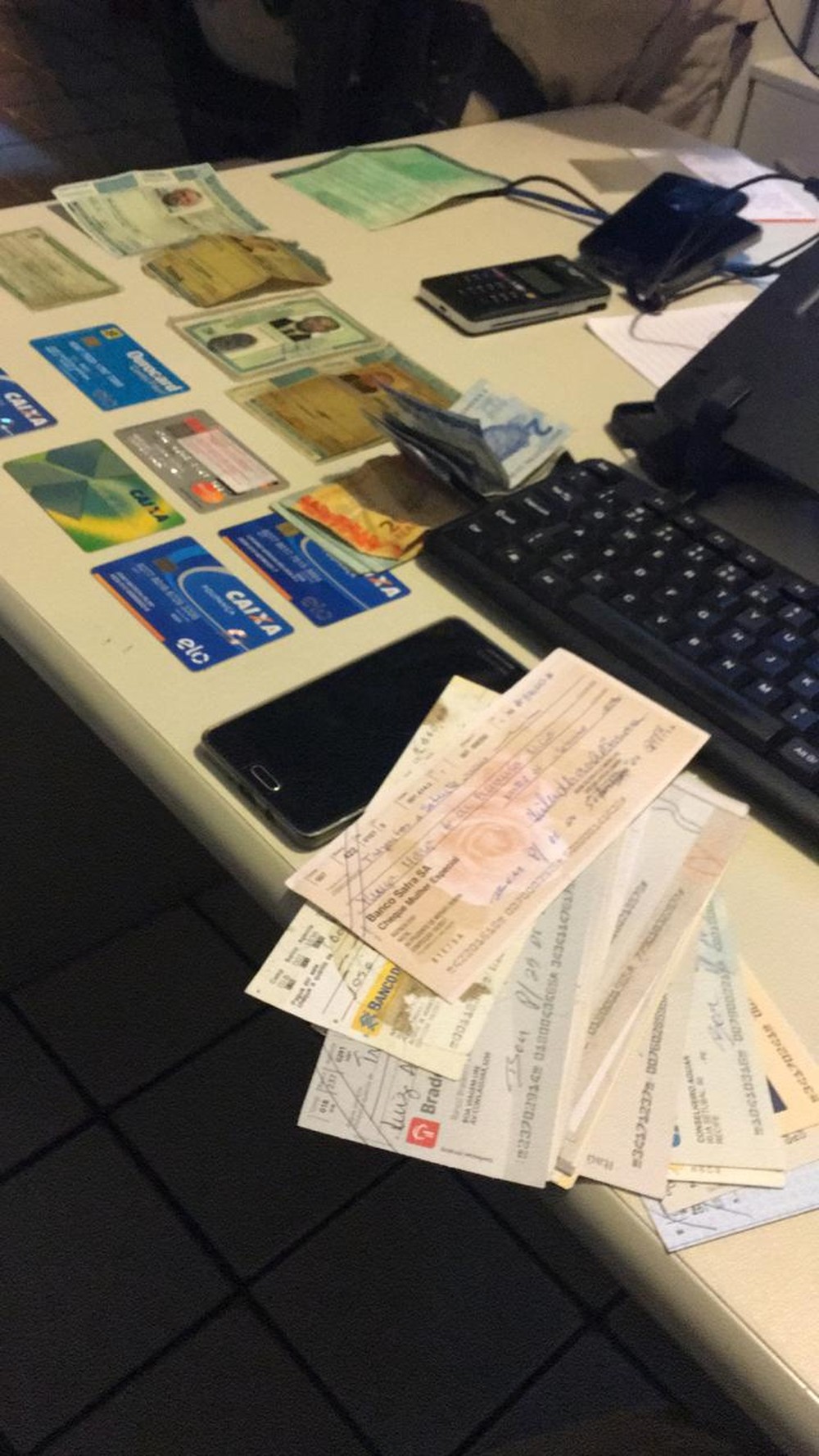 Com o suspeito, foram encontrados uma carteira de identidade falsa, três celulares, uma máquina de passar cartão, três carteiras de habilitação com nomes diferentes, quatro pen drives, seis cartões de bancos, além de 37 folhas de cheques preenchidas. O homem foi detido e encaminhado com todo material apreendido para a Delegacia da Polícia Federal em Natal.