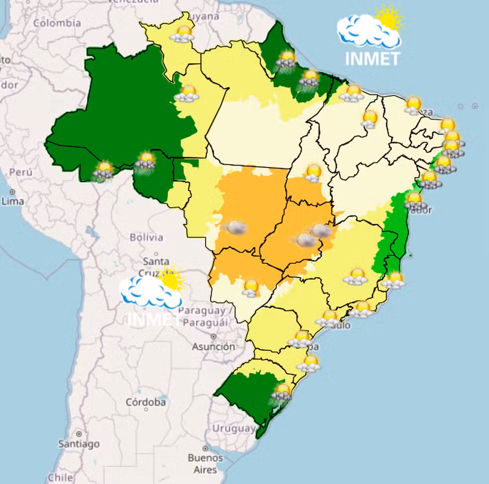 Já no sul do Amazonas, no Acre e em Rondônia, a frequência de nuvens e precipitações tende a aumentar de forma gradual, reduzindo um pouco o calorão em alguns períodos.