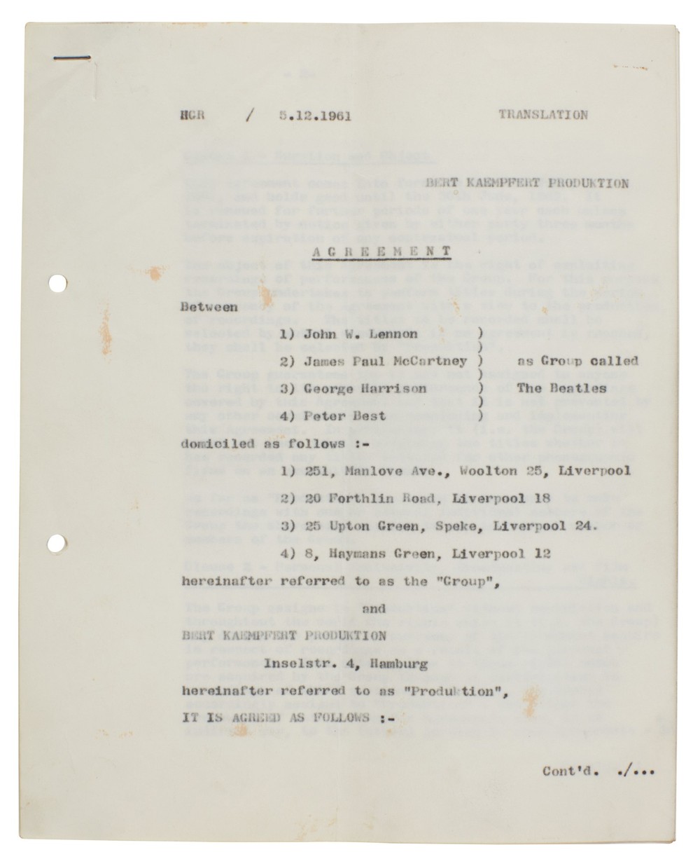 Este é o primeiro de dois contratos que o grupo inglês assinou com Epstein, uma vez que foi preciso fazer um novo documento depois que Best foi substituído por Ringo Starr.