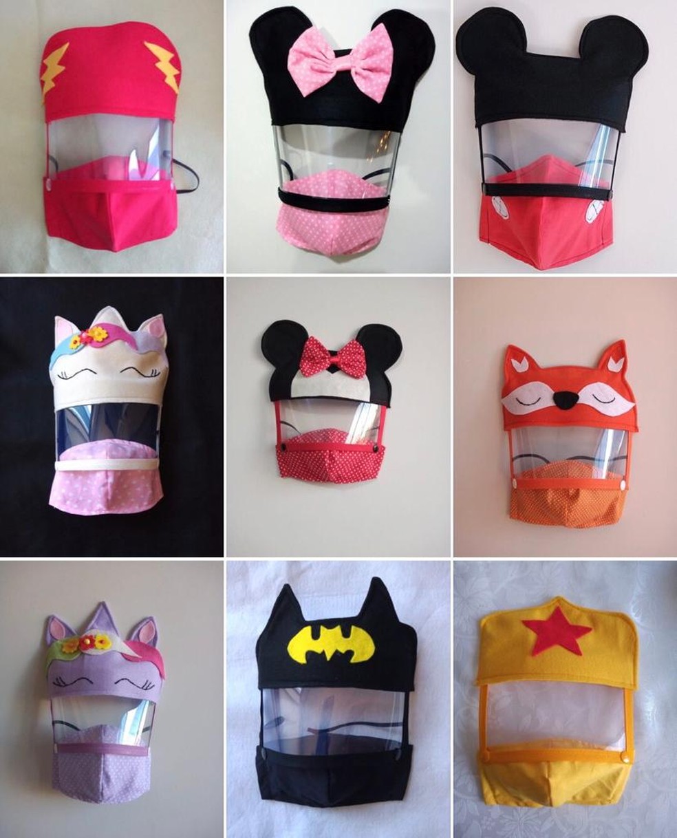 Mulher-Maravilha, Batman e Homem-Aranha são alguns dos temas e a máscara de acrílico vem acompanhada de uma de pano, essencial para garantir a proteção. Mônica conta que começou a fazer os acessórios para as crianças da família, no entanto, logo vieram mais pedidos, e a atividade virou um complemento de renda.