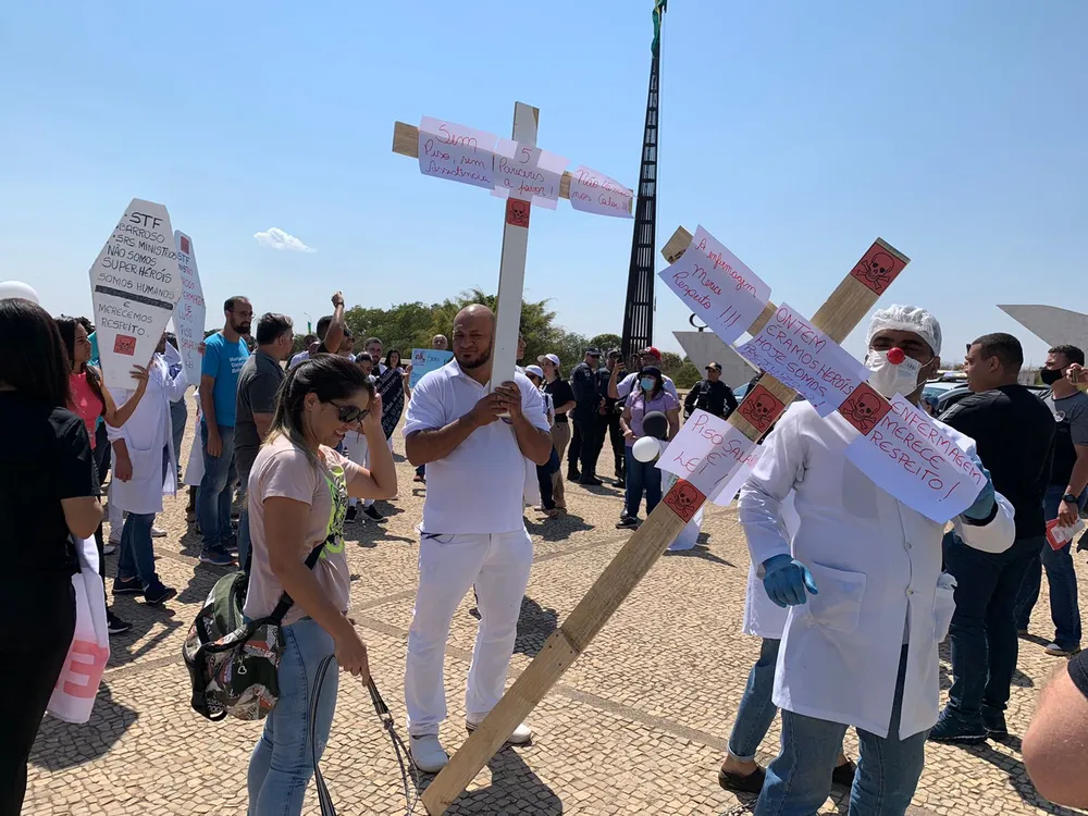 Com faixas pedindo a aplicação da medida e cruzes, os profissionais se reuniram na Praça dos Três Poderes. A manifestação foi organizada por sindicatos da categoria e é acompanhada pela Polícia Militar.