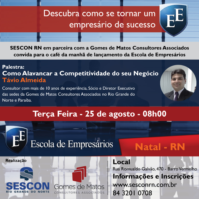 Em parceria com o SESCON-RN, a Gomes de Matos promove no próximo dia,25, um café da manhã, às 8h, na sede do Sindicato, para o lançamento da Escola de Empresários. Na ocasião, Távio Almeida, diretor executivo da Gomes de Matos, irá ministrar a palestra “Como alavancar a Competividade do seu Negócio”. Os interessados em conhecer um pouco do Programa Escola de Empresários podem participar da palestra. As inscrições podem ser feitas no SESCONRN.