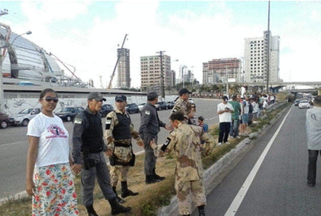 Policiais e bombeiros militares bloquearam uma via da BR-101, na altura do viaduto do Quarto Centenário, em protesto pedindo que a Lei de Promoção de Praças seja enviada para apreciação da Assembleia Legislativa. Por causa do movimento, o trânsito na região ficou congestionado. O protesto começou com um “abraço” simbólico à Arena das Dunas. Em seguida, os militares seguiram para uma caminhada na rodovia. Desde o início da semana passada, os militares estão acampados em frente a sede da Governadoria, no Centro Administrativo. Além de pedir pela Lei de Promoções, a categoria também lançou um movimento pedindo condições mais seguras dos equipamentos usados, como viaturas.