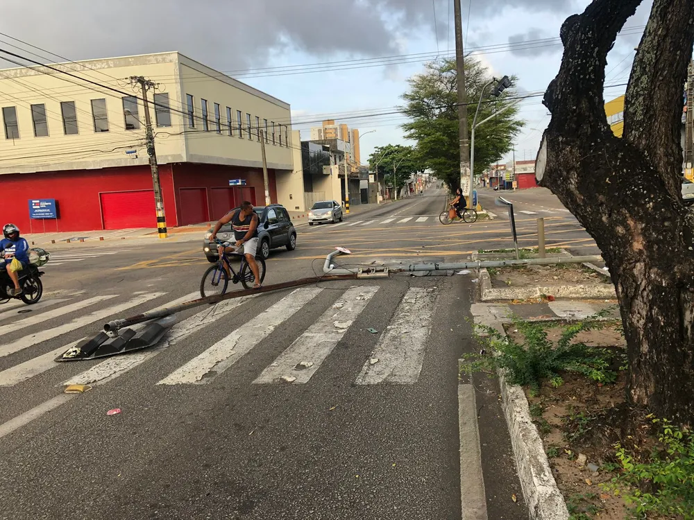 A queda de um poste e de um semáforo interditou parcialmente o cruzamento da Avenida Nevaldo Rocha e Rua Jaguarari, no bairro Lagoa Nova, na Zona Sul de Natal, na manhã desta quarta-feira (26).