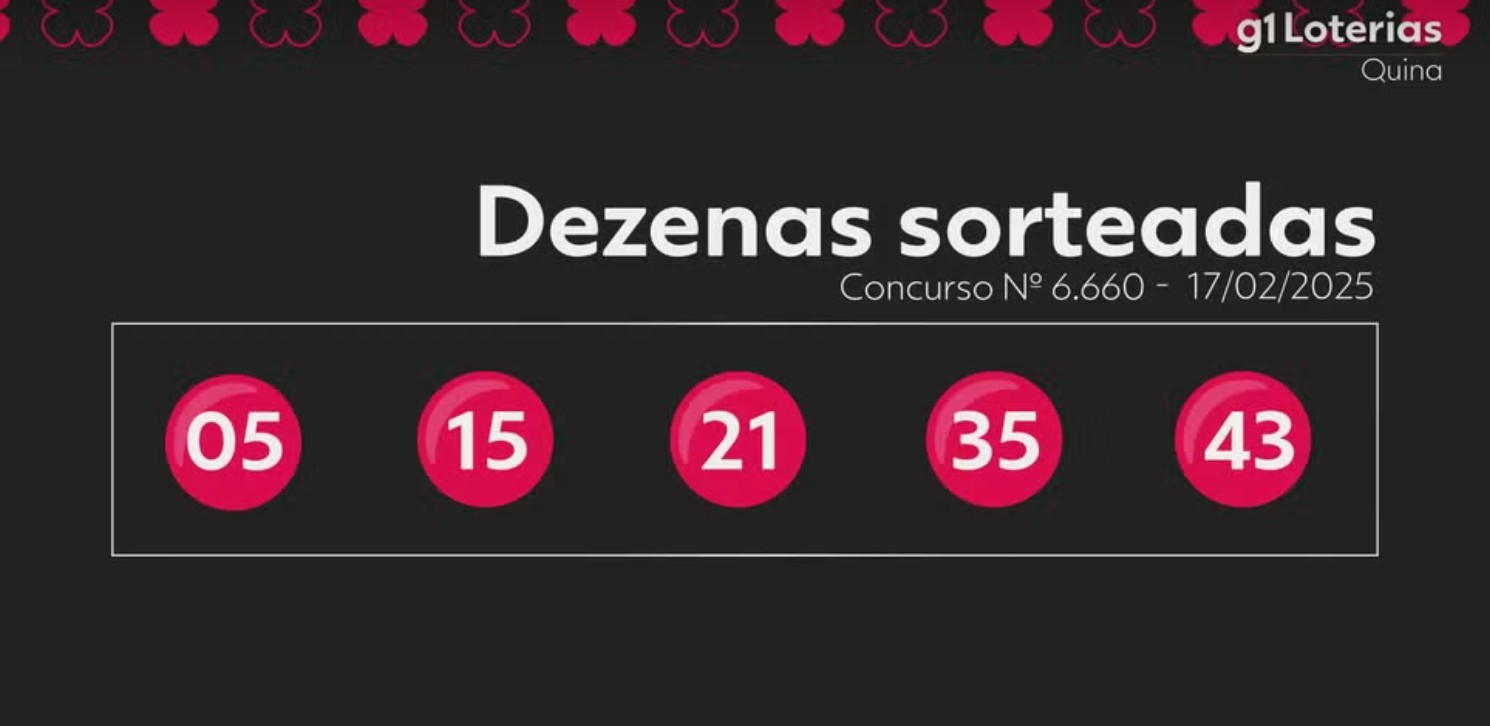 Veja abaixo os números do sorteio do concurso 6660 da Quina realizado nesta segunda-feira (17):