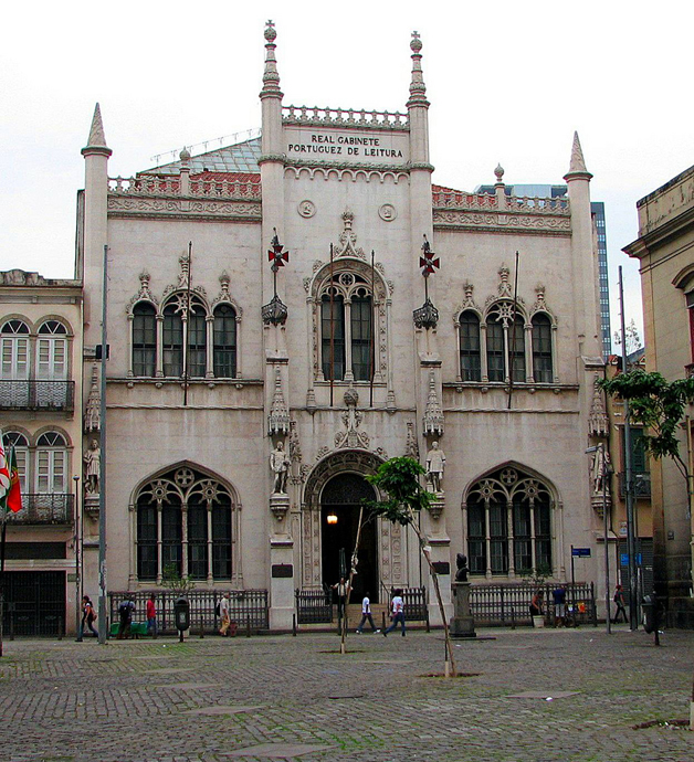 A construção do edifício só foi concluída em 1887, e o Real Gabinete Português tornou-se um marco arquitetônico e cultural da presença aqui de Portugal. Assim, as quatro estátuas que recebem os visitantes na fachada do edifício não poderiam ser outras: Pedro Álvares Cabral, Luís de Camões, Infante Dom Henrique e Vasco da Gama. Na mesma fachada, quatro medalhas lembram grandes escritores lusitanos: Fernão Lopes, Gil Vicente, Alexandre Herculano e Almeida Garrett.