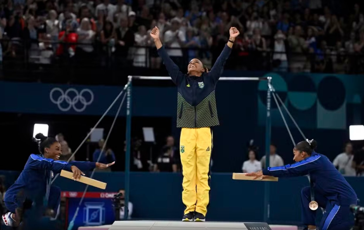 Foi um dia de emoção e redenção. Rebeca havia falhado na final de trave menos de uma hora antes e ficado fora do pódio. Mas levantou a cabeça e entregou tudo no tablado, com um solo belíssimo, chegadas praticamente cravadas ao fim de cada acrobacia e as lágrimas de quem sabia que havia encerrado sua participação nas Olimpíadas de Paris com uma apresentação de encantar o mundo todo. Simone Biles fez acrobacias incríveis, mas falhas na execução a deixaram com a medalha de prata. A americana Jordan Chiles ficou com o bronze.