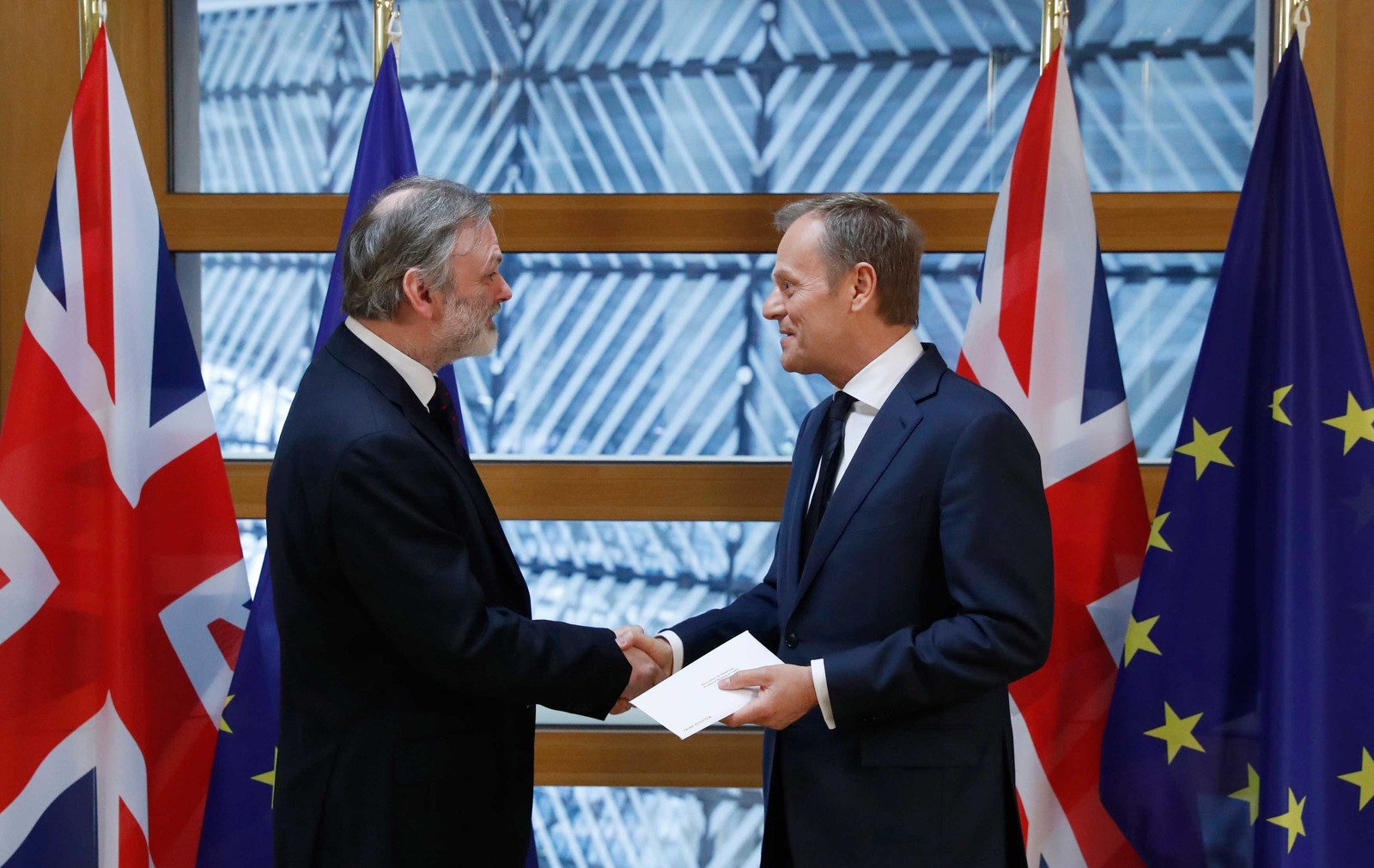 O embaixador britânico na União Europeia, Tim Barrow, entregou nesta manhã ao presidente do Conselho Europeu, Donald Tusk, uma carta que simboliza o acionamento do Artigo 50 do Tratado de Lisboa – dando início às discussões sobre o processo de afastamento. A carta de seis páginas é assinada pela pela premiê britânica, Theresa May.