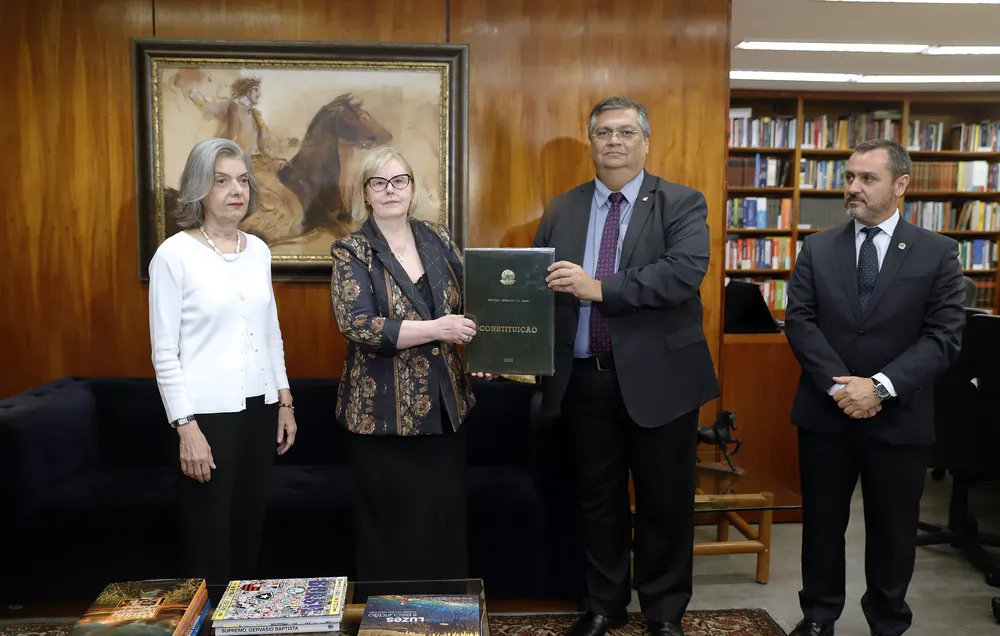 A presidente do STF, ministra Rosa Weber, recebeu a Constituição das mãos do ministro da Justiça e Segurança, Flávio Dino.