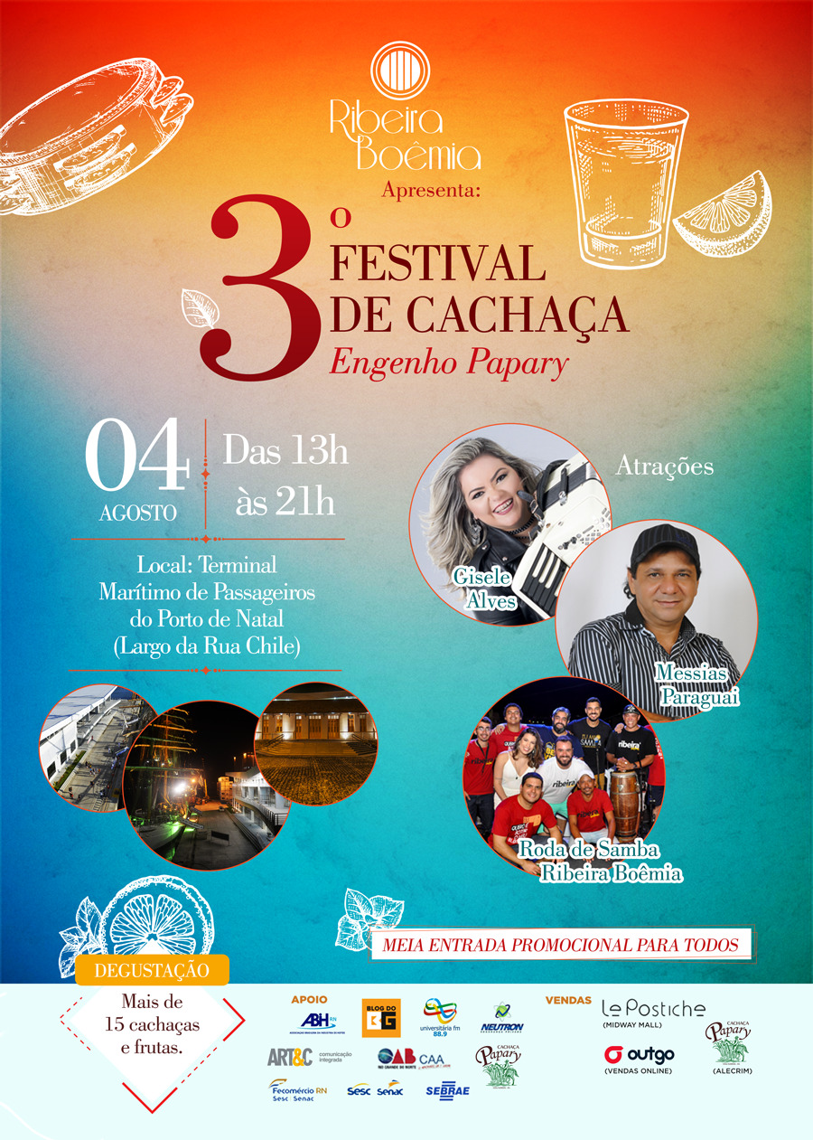 A mistura do samba, com forró e brega, mais a degustação de cachaças, e inaugurando o mais novo espaço de eventos da capital, em um cenário deslumbrante. Esta é a fórmula do 3º Festival de Cachaça Engenho Papary, que será promovido pelo Projeto Cultural Ribeira Boêmia, no Terminal Marítimo de Passageiros do Porto de Natal, às margens do Rio Potengi, de frente para o pôr do sol mais espetacular de Natal.