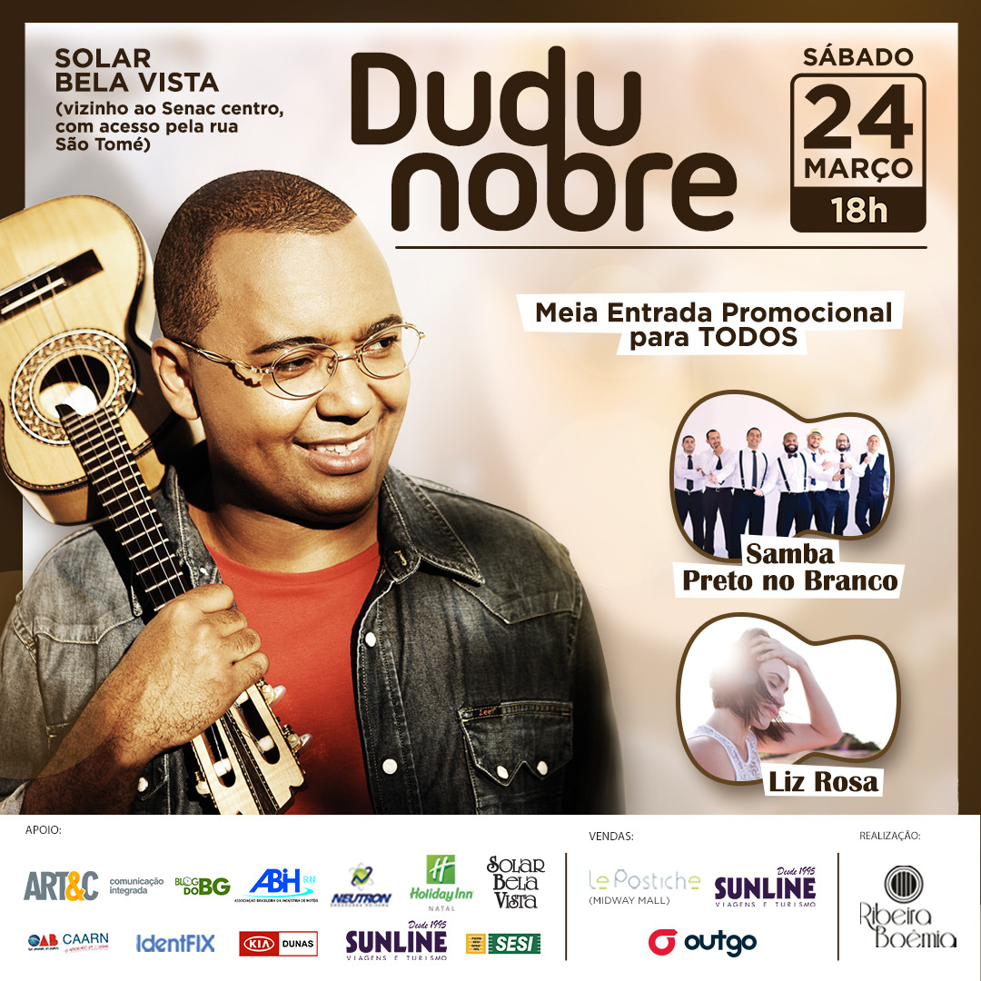 Como já é tradição, a próxima edição do Ribeira Boêmia promete ser uma noite de muito samba! Pela primeira vez o Projeto Cultural terá como convidado o cantor e compositor carioca Dudu Nobre. O show acontecerá no próximo sábado, 24.03, no Solar Bela Vista, a partir das 18h, e terá também a participação da cantora potiguar, hoje radicada nos EUA, Liz Rosa. O show de abertura fica por conta do Preto no Branco, um dos grupos de samba de maior destaque e projeção na atualidade.