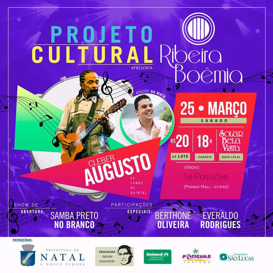Projeto Cultural Ribeira Boêmia traz a Natal, mais uma vez, “A voz calada do Samba”, Cleber Augusto, um dos ícones do grupo Fundo de Quintal, e o potiguar, hoje radicado no Rio de Janeiro, André da Mata. Show de abertura com o Samba Preto no Branco e participações especiais dos sambistas Berthone Oliveira e Everaldo Rodrigues.