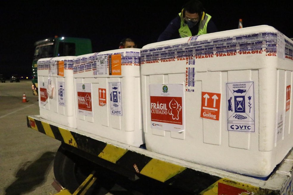 Junto com o lote da vacina Astrazeneca/Fiocruz, chegaram na madrugada 93,5 mil vacinas.
