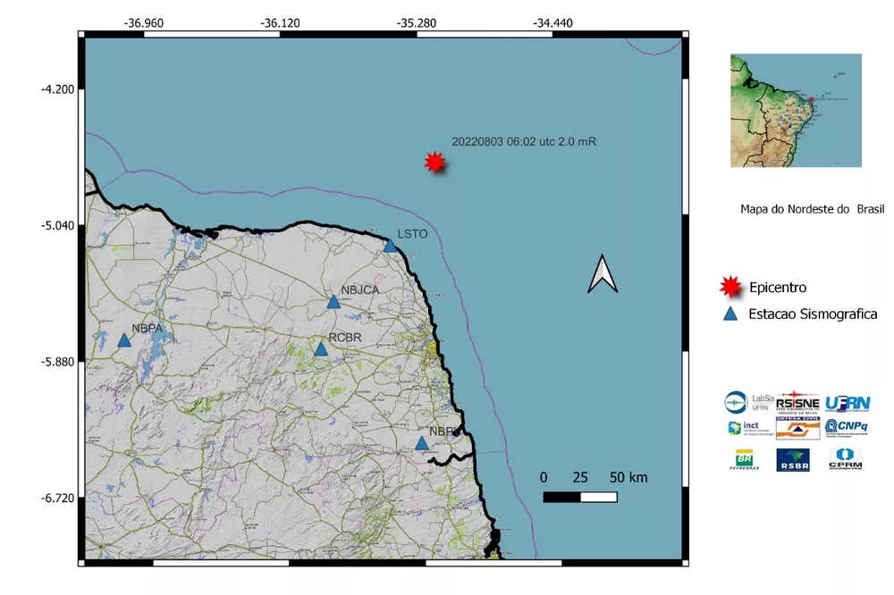 O Laboratório Sismológico da UFRN registrou um novo tremor de terra no Rio Grande do Norte nesta quarta-feira (3), desta vez de magnitude 2.0. O epicentro do abalo sísmico foi no mar, próximo à cidade de Touros.