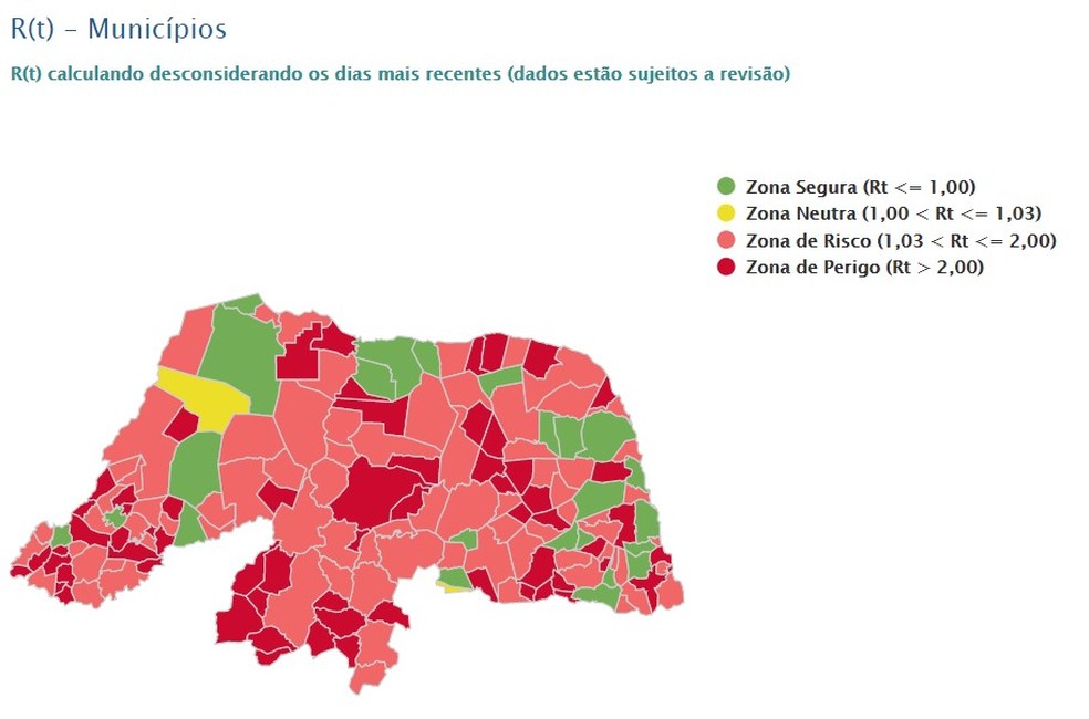 Em relação à transmissão da Covid-19, o RN tem 24 municípios em zona segura, quando a taxa de transmissão é menor de 1; dois municípios em zona neutra, com taxa entre 1 e 1,03; 78 municípios em risco, com taxa entre 1,03 e 2; e 63 em zona de perigo, quando a taxa de transmissão é maior que 2.