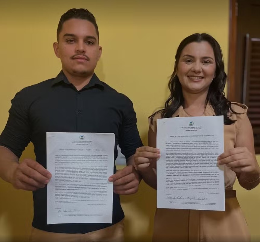 Viúva do prefeito Marcelo Oliveira (União), assassinado junto com o pai Sandi Oliveira durante a campanha eleitoral de 2024, Fatinha de Marcelo (União) tomou posse do cargo de prefeita de João Dias nesta quarta-feira (1º). A cidade de pouco mais de 2 mil habitantes fica na região Oeste do Rio Grande do Norte.