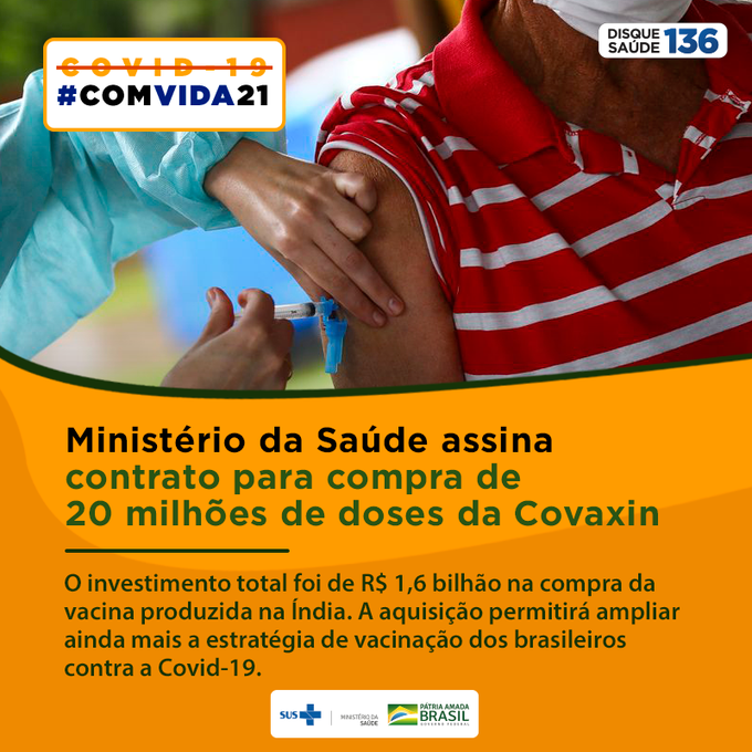 O Ministério da Saúde assinou nessa quinta-feira (25) contrato para compra de 20 milhões de doses da vacina Covaxin da Precisa Medicamentos/Bharat Biotech. O investimento total foi de R$ 1,614 bilhão na compra da vacina produzida na Índia.