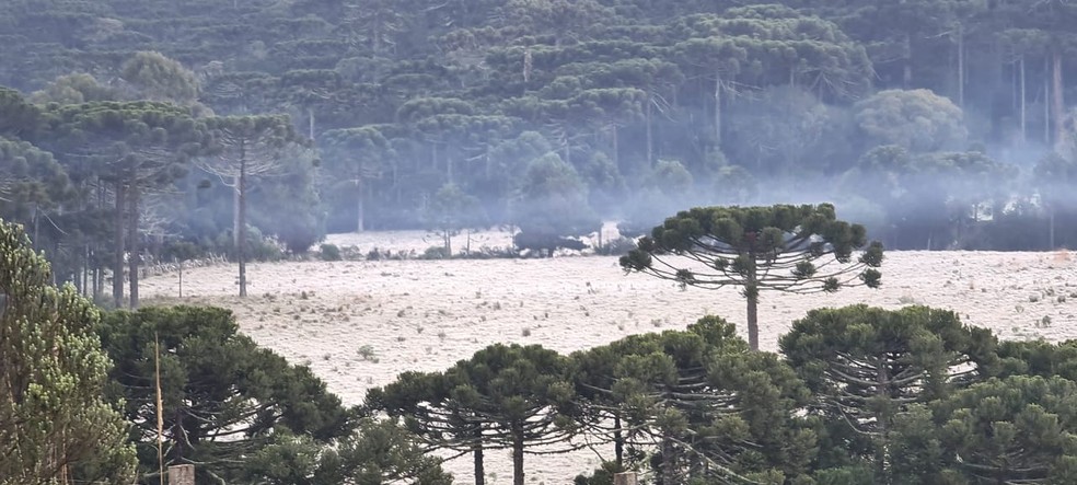 Já São Joaquim, também na Serra, onde a marca mínima foi de 1,8°C às 7h, a vegetação ficou coberta pela geada.