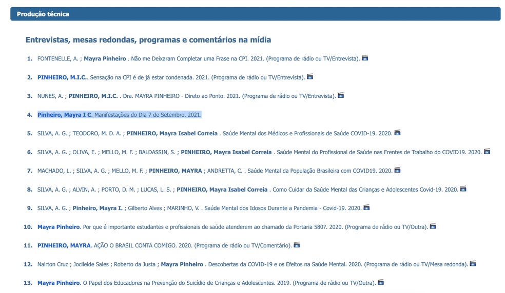 A secretária do Ministério da Saúde Mayra Pinheiro, que ficou conhecida como “capitã cloroquina” por defender o uso do medicamento contra a Covid-19 apesar de sua ineficácia, incluiu em seu currículo acadêmico a participação nos atos antidemocráticos do dia 7 de setembro de 2021.