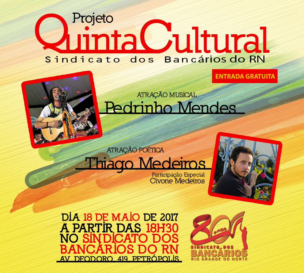 Nesta quinta-feira (18), a partir das 18h30, no auditório José Campelo Filho (Av. Deodoro da Fonseca), acontecerá a 2ª edição do Projeto Quinta Cultural, promovido pelo Sindicato dos Bancários do RN.