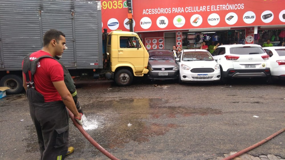 De acordo com o motorista, o caminhão perdeu o freio e para evitar bater no outro caminhão que seguia à sua frente, ele puxou o veículo para a esquerda. Na ação, acabou atingido carros e motos que estavam estacionados.