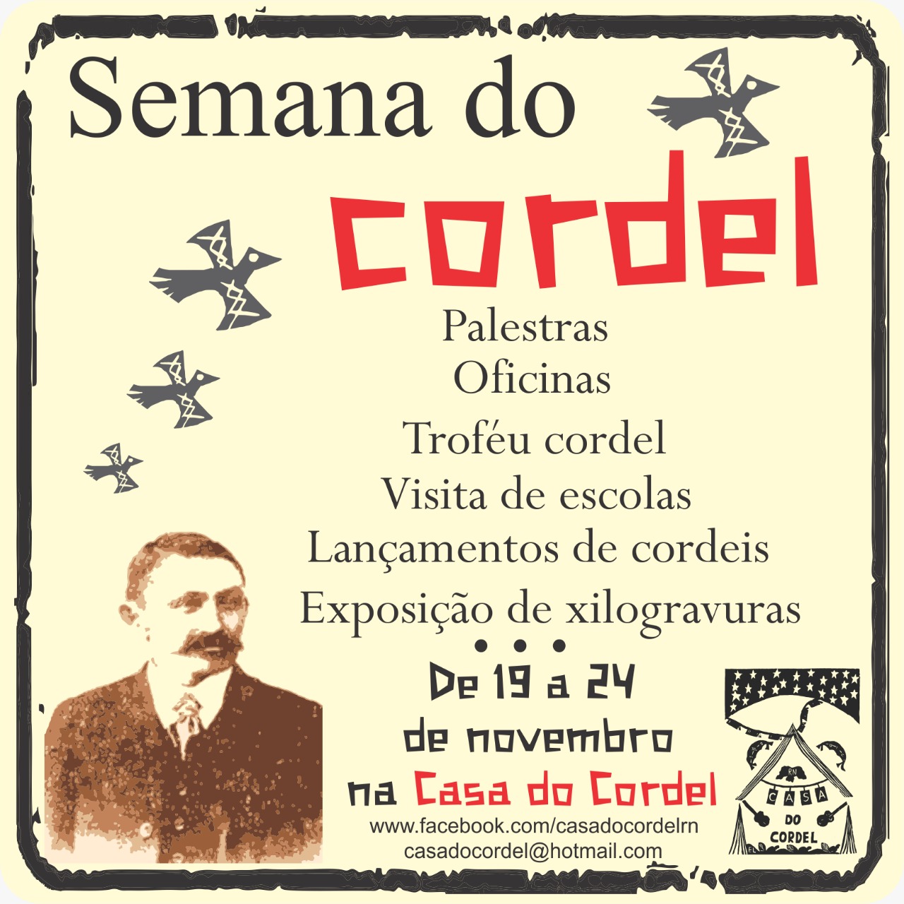 A Casa do Cordel está promovendo, até o próximo sábado (24), a Semana do Cordel com programações diárias e gratuitas que contam com Oficinas de Cordel, Xilogravura, palestras sobre Literatura de Cordel, entre outras atividades culturais.
