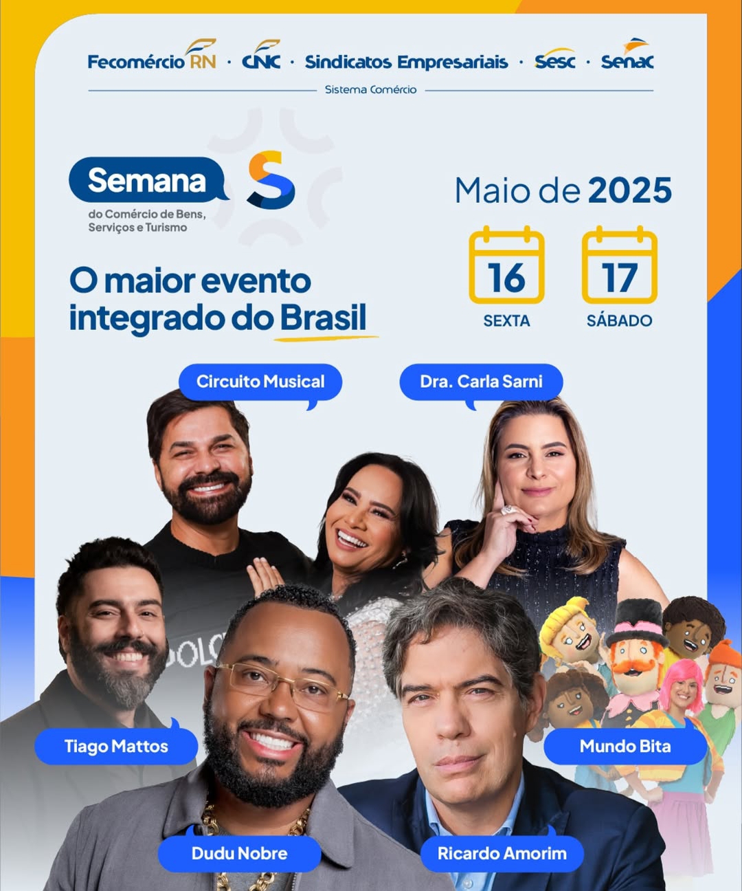Idealizado pela Confederação Nacional do Comércio de Bens, Serviços e Turismo (CNC), o Dia S será celebrado simultaneamente em todas as unidades federativas no dia 17 de maio. Em Natal, o evento terá como palco principal a Casa de Apostas Arena das Dunas, com uma programação vibrante que inclui os shows de Mundo Bita, Circuito Musical e Dudu Nobre, além de atividades espalhadas pelo Largo da Arena e pelo Espaço Hospitalidade.