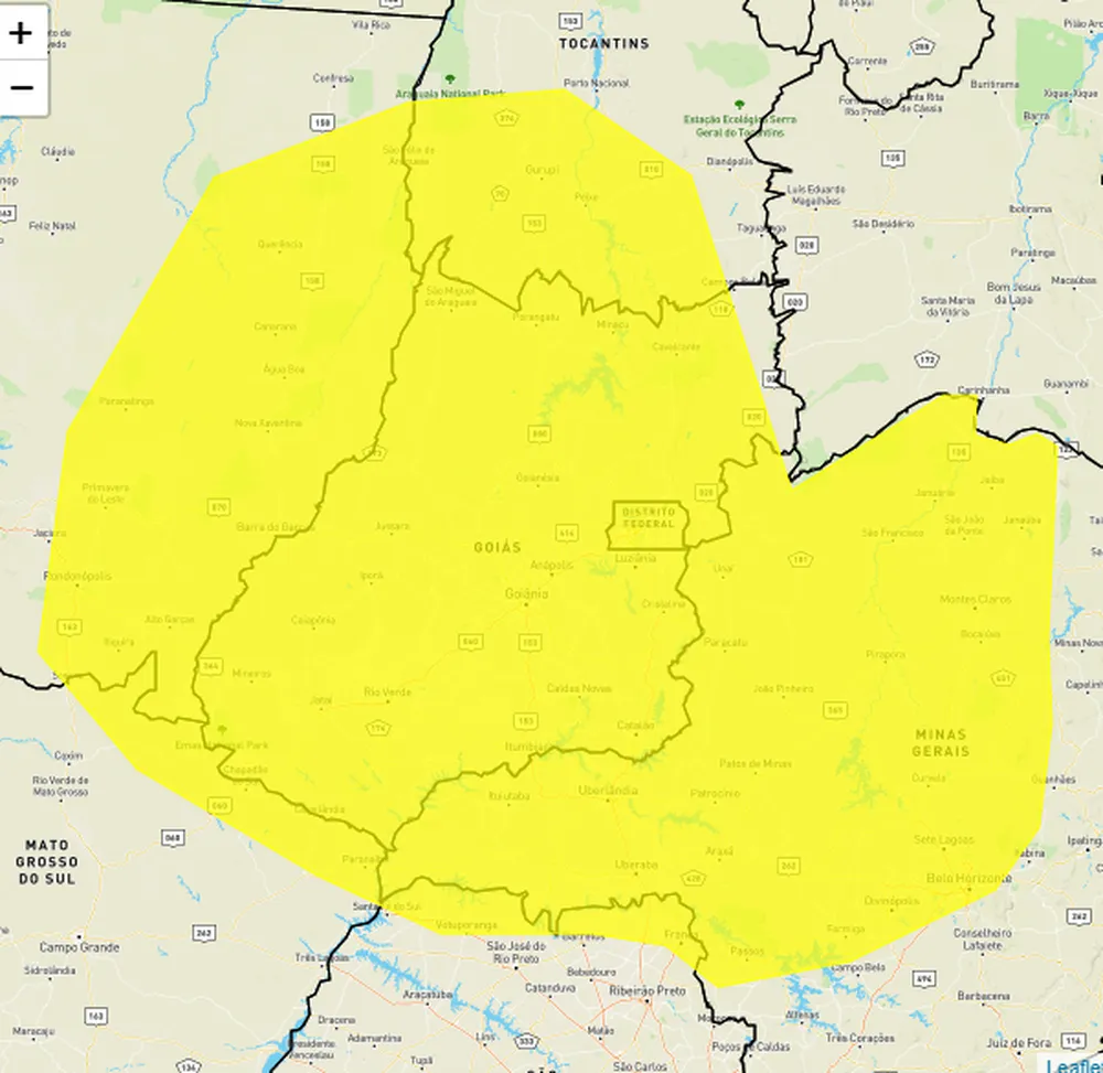 O Inmet emitiu um alerta de altas temperaturas até as 19h da próxima quarta-feira (14) para quase todo o estado de Goiás, sul do Tocantins, leste do Mato Grosso e a metade oeste de Minas Gerais.