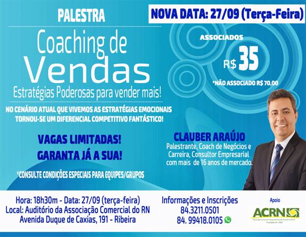 A paralisação do sistema de transporte coletivo em Natal, na ultima quinta-feira, levou a ACRN a transferir a Palestra Coaching de Vendas – Estratégias poderosas para vender mais, para a próxima terça-feira, 27 de setembro, às 18h30m. As informações desencontradas sobre a paralisação dos ônibus e a realização de eventos (manifestações) na cidade poderiam dificultar a chegada dos participantes ao evento. Ao mesmo tempo, a ACRN informa que as inscrições para palestra ainda podem ser feitas até a próxima terça-feira, dia 27.