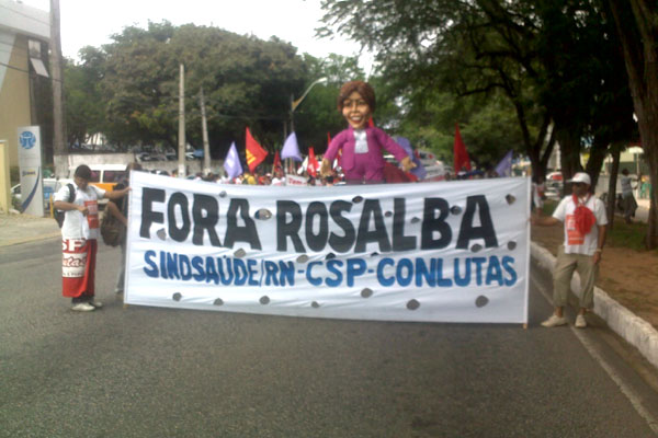 Servidores em greve da Saúde e Educação realizam uma mobilização na manhã desta sexta-feira (16) em direção a sede da Governadoria, no Centro Administrativo. Cerca de 200 grevistas ocupam uma pista da avenida Hermes da Fonseca e o trânsito na região está lento. Os manifestantes pretendem realizar uma reunião com Rosalba Ciarlini, porém, de acordo com o presidente do Sindicato dos Policiais Civis (Sinpol), a governadora está em Mossoró participando de um evento sobre segurança pública. De acordo com Fátima Cardoso, coordenadora geral do Sindicato dos Trabalhadores em Educação (Sinte), uma pesquisa realizada em 306 escolas do estado mostrou que 94% enfrentam problemas de infraestrutura e sucateamento. Ela afirma que, atualmente, o RN tem um déficit de 1.500 professores para a rede estadual.