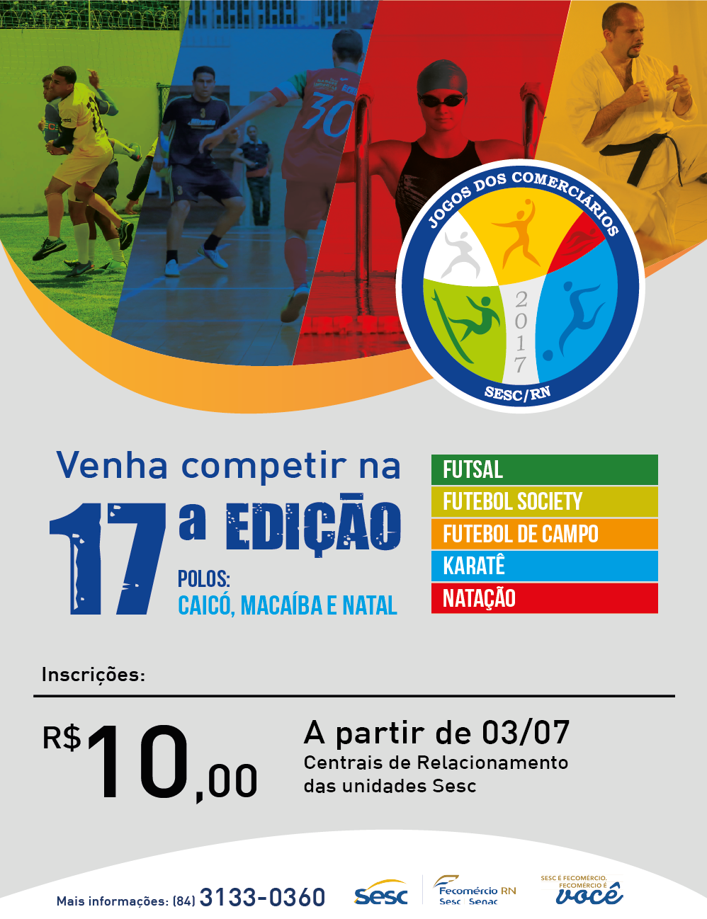 Os Jogos dos Comerciários está chegando á sua 17ª edição. A iniciativa do Sistema Fecomércio, realizada por meio do Serviço Social do Comércio do Rio Grande do Norte (Sesc RN), promoverá torneios em cinco modalidades nas cidades de Natal, Caicó e Macaíba. As inscrições, que variam conforme a modalidade, têm início dia 03 de julho, e podem ser feitas nas centrais de relacionamento das unidades Sesc. Os comerciários poderão disputar nas seguintes modalidades: futsal, futebol society, natação e karatê, em Natal; futebol Society em Macaíba; e futsal e futebol de campo em Caicó. As inscrições podem ser feitas nas Centrais de Atendimento das unidades Sesc das cidades. As taxas e os períodos para se inscrever variam de acordo com a modalidade escolhidas. Serão realizadas aberturas em Natal dia 18/08, com desfile dos atletas, tocha olímpica e juramento do atleta; e dia 15/09 em Caicó. A premiação contará com troféus e medalhas para primeiro, segundo e terceiro colocados de todas as modalidades, e medalhas de participação para todos os atletas do karatê.
